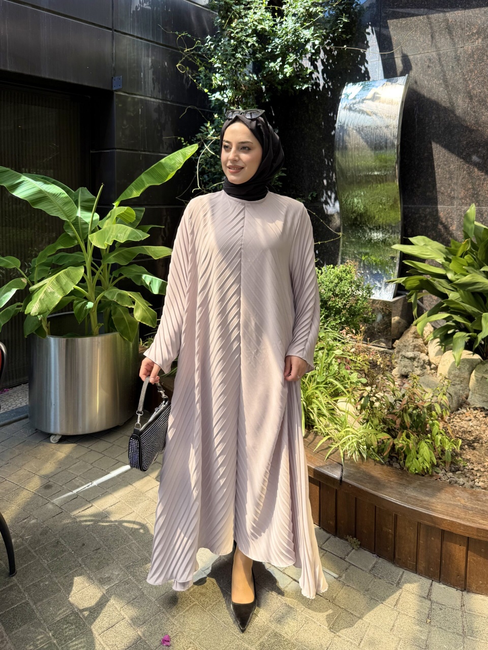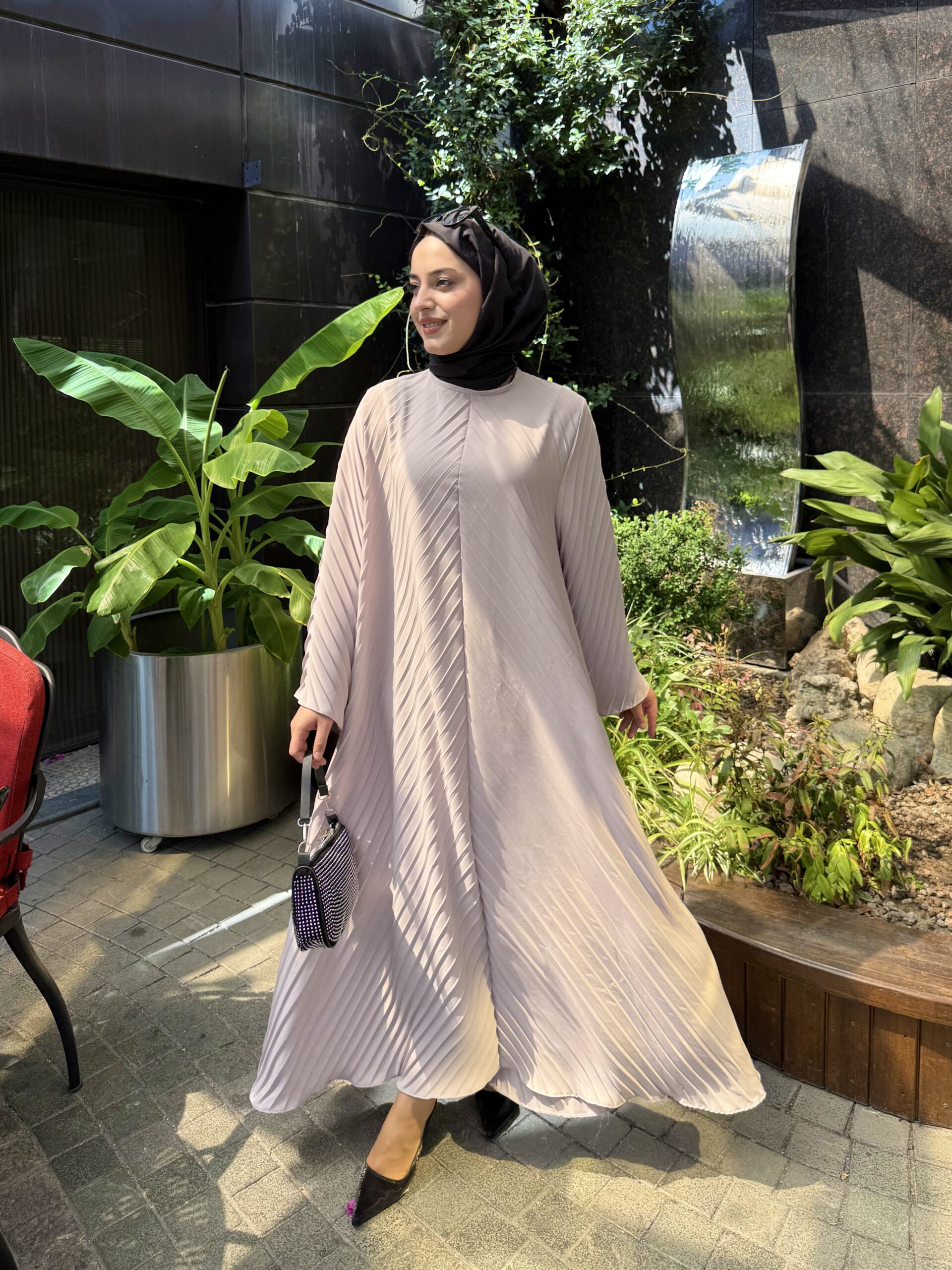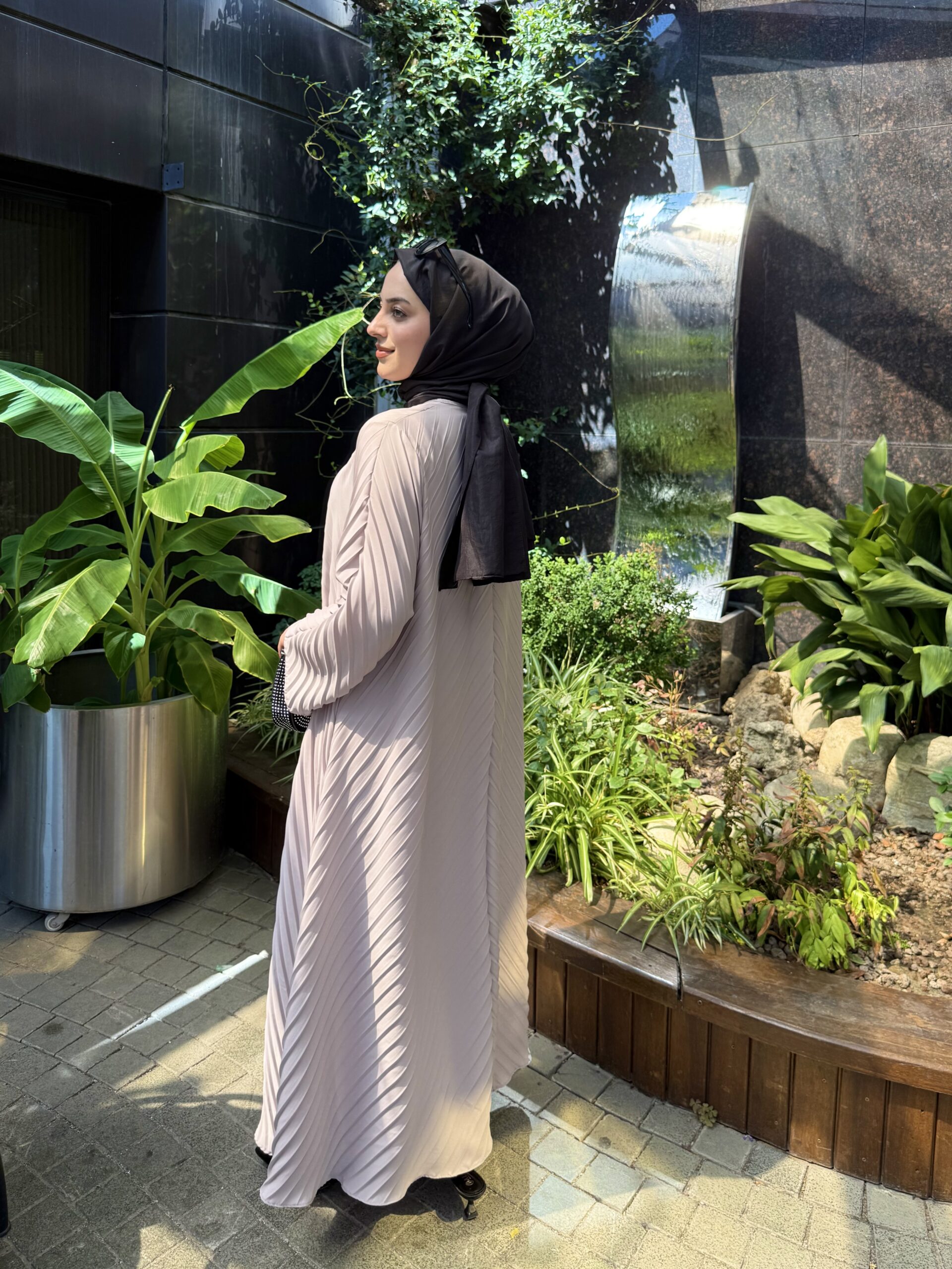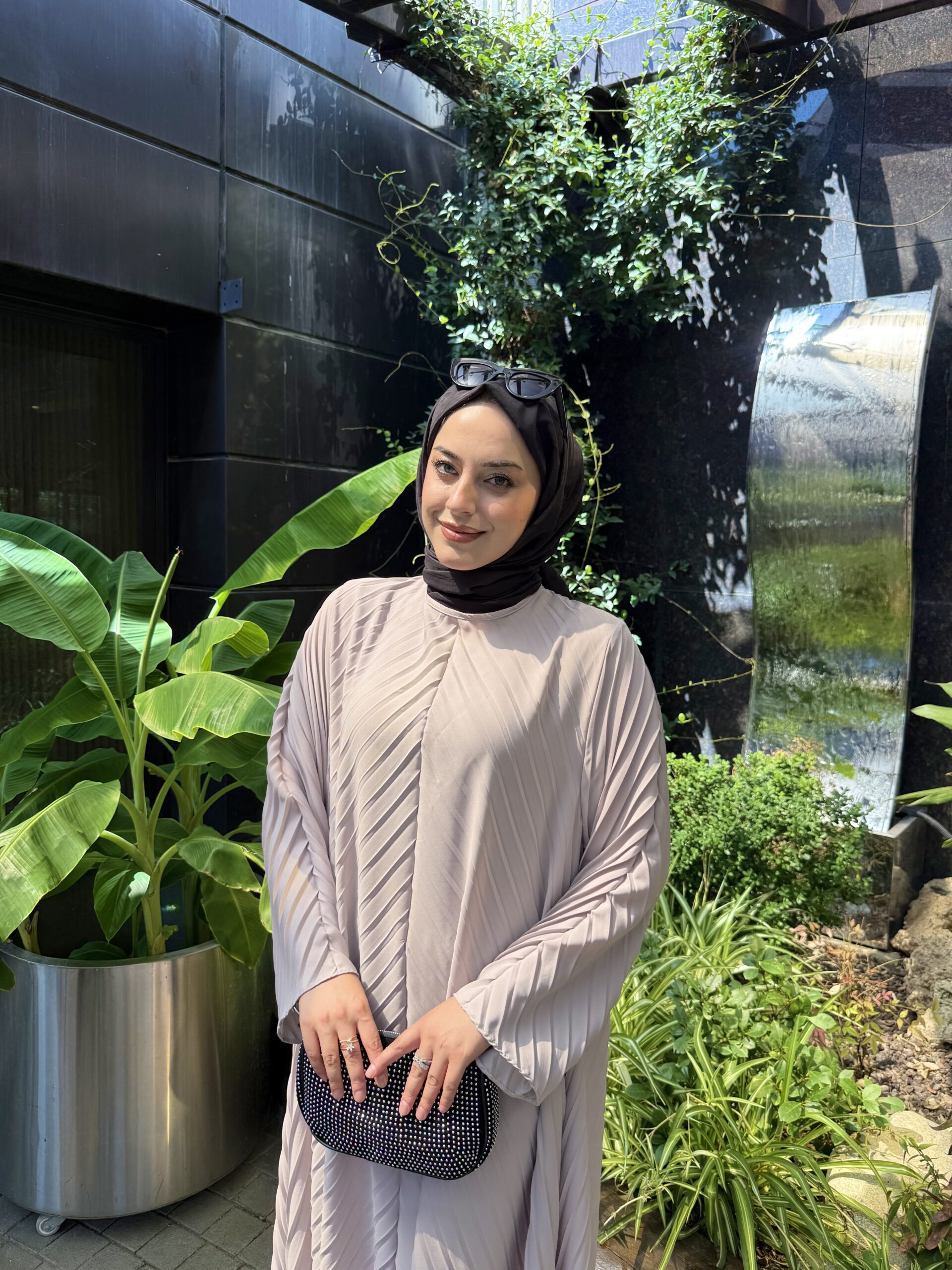 Şıklık ve rahatlığı bir araya getiren Pilise Elbise Abaya, medine ipeği kumaşıyla zarif bir duruş sunar. Bej tonlardaki pilise desenleriyle modern ve konforlu bir stil yakalayın.
