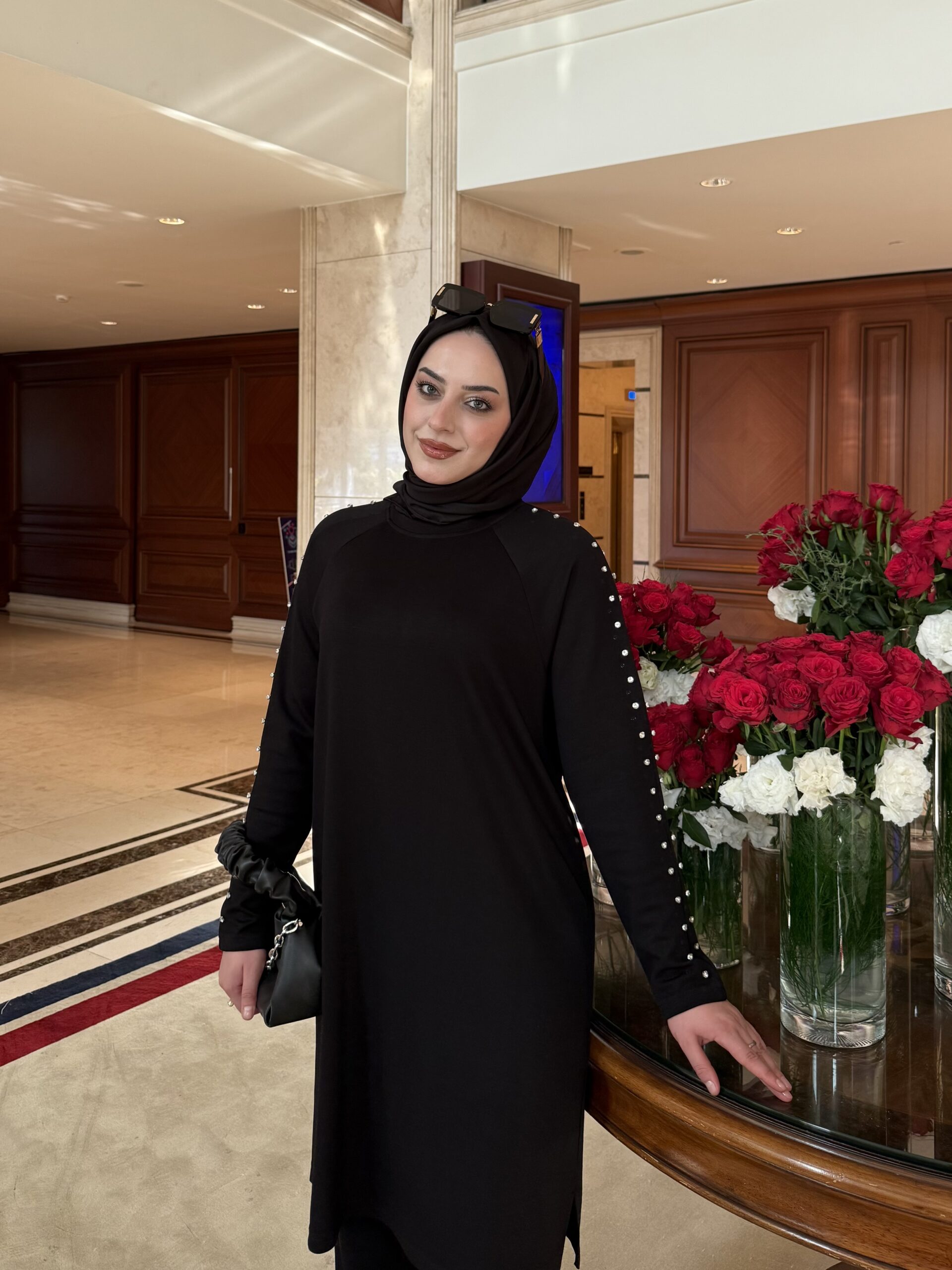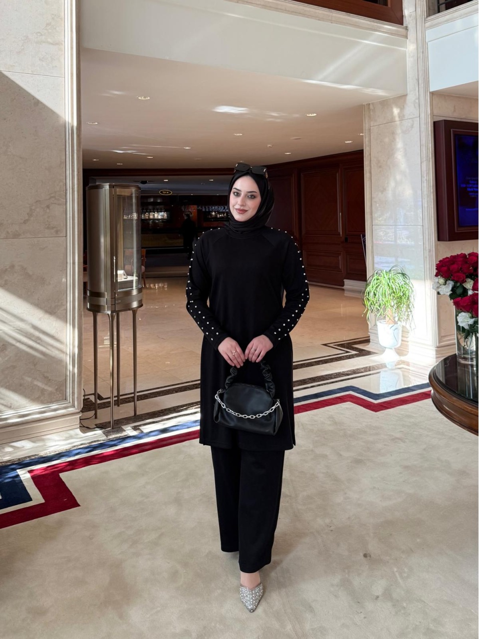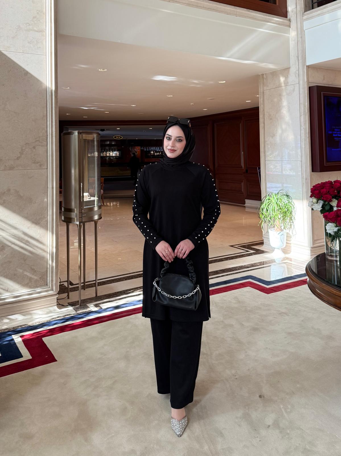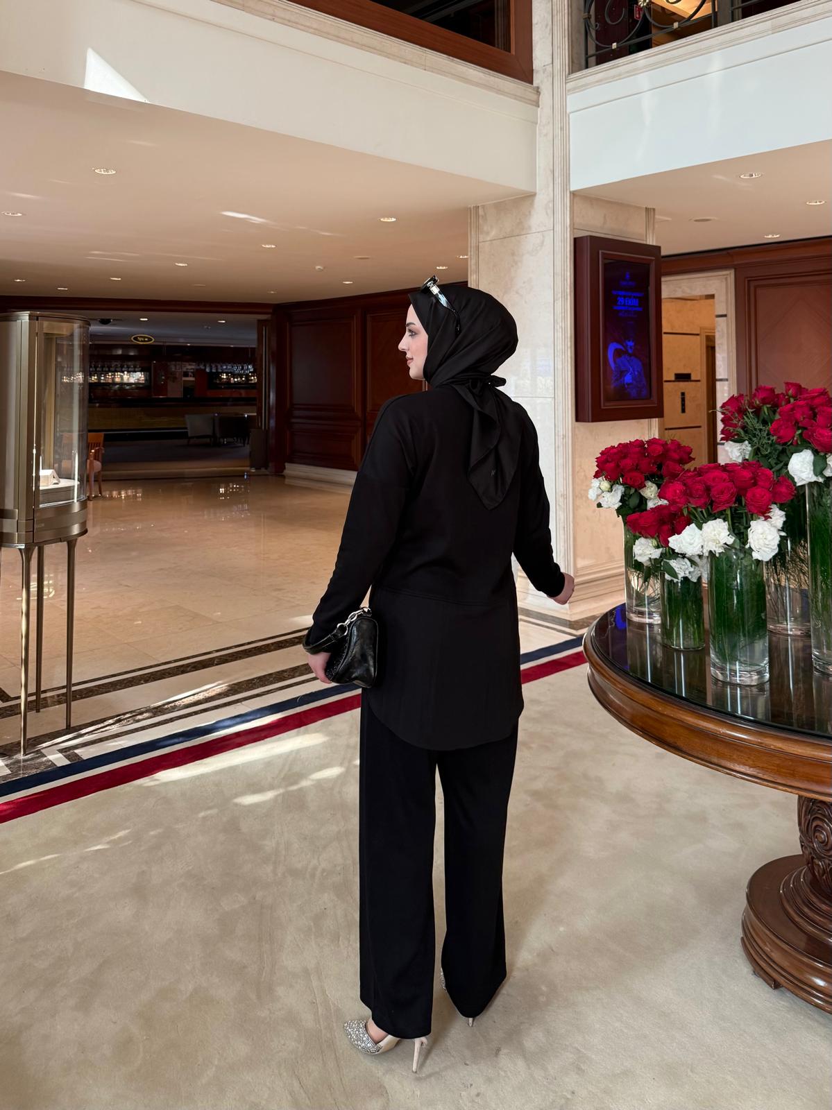 Zarafet ve rahatlığı bir araya getiren Veyra Takım, tunik ve bol paça pantolon uyumuyla modern bir siluet oluşturur. 100 cm tunik boyu ve 102 cm pantolon boyuyla dengeli bir görünüm sunar. Üzerindeki çakma Beyoğlu taşları parlak detaylarıyla ışıltı katar ve dökülme yapmaz.